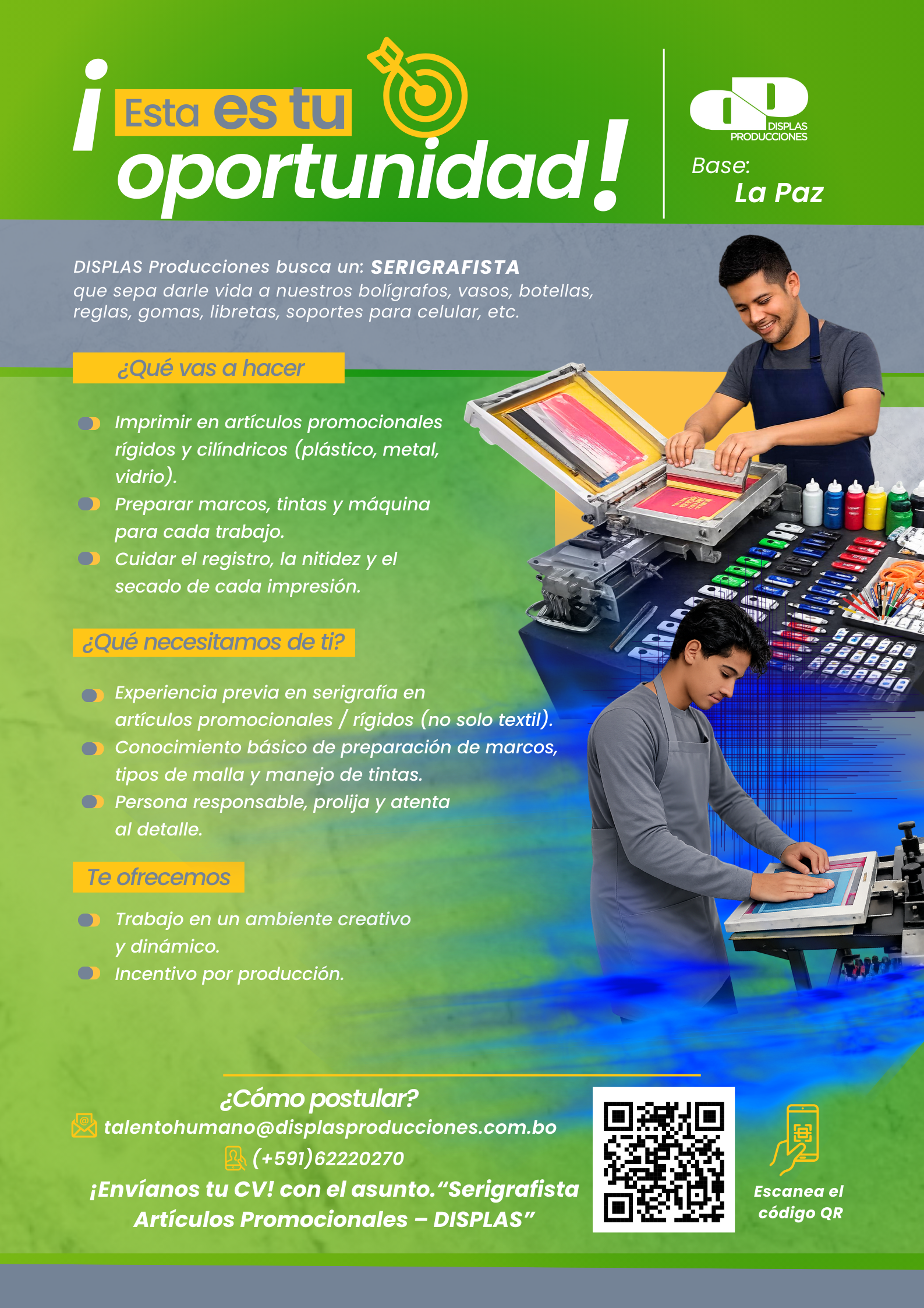 En DISPLAS Producciones buscamos un/a Serigrafista que sepa darle vida a nuestros bolígrafos, vasos, botellas, reglas, gomas, libretas, soportes para celular, etc. 🎁