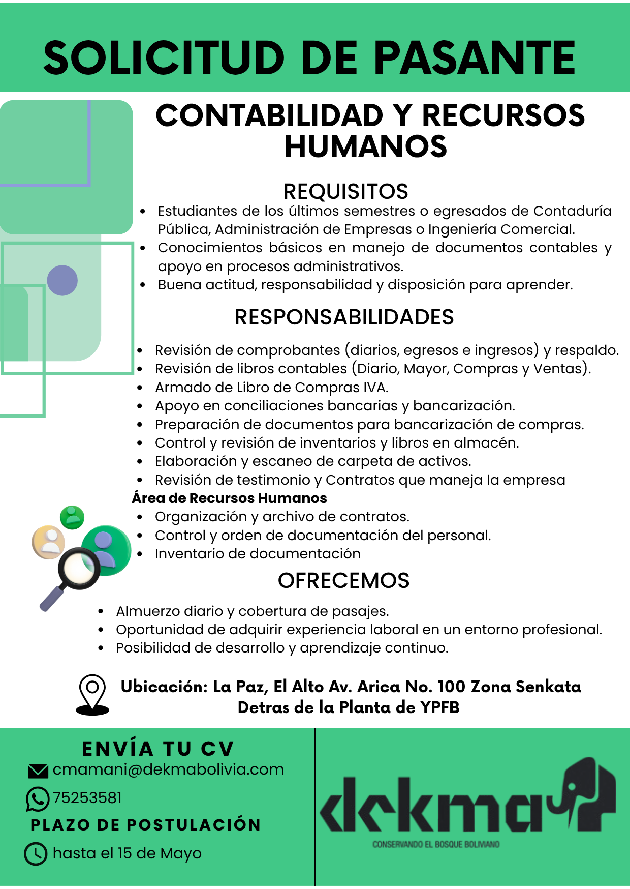 👉 cmamani@dekmabolivia.com - Especificando en el asunto: Postulación Pasantía de contabilidad y Recursos humanos