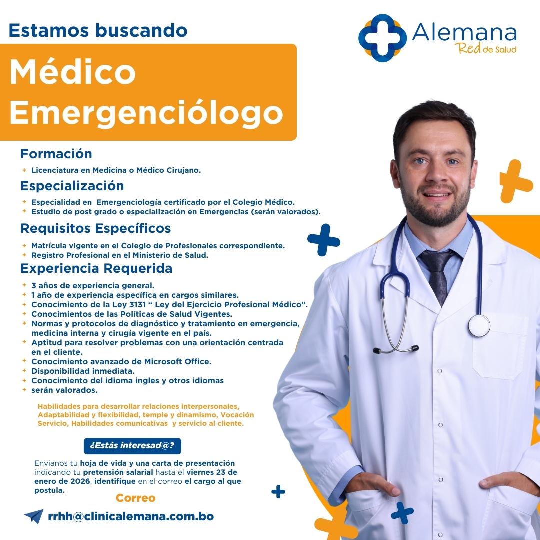 En Alemana Red de Salud estamos en la búsqueda de un/a Médico Emergenciólogo comprometido/a con la atención oportuna, humana y de calidad.