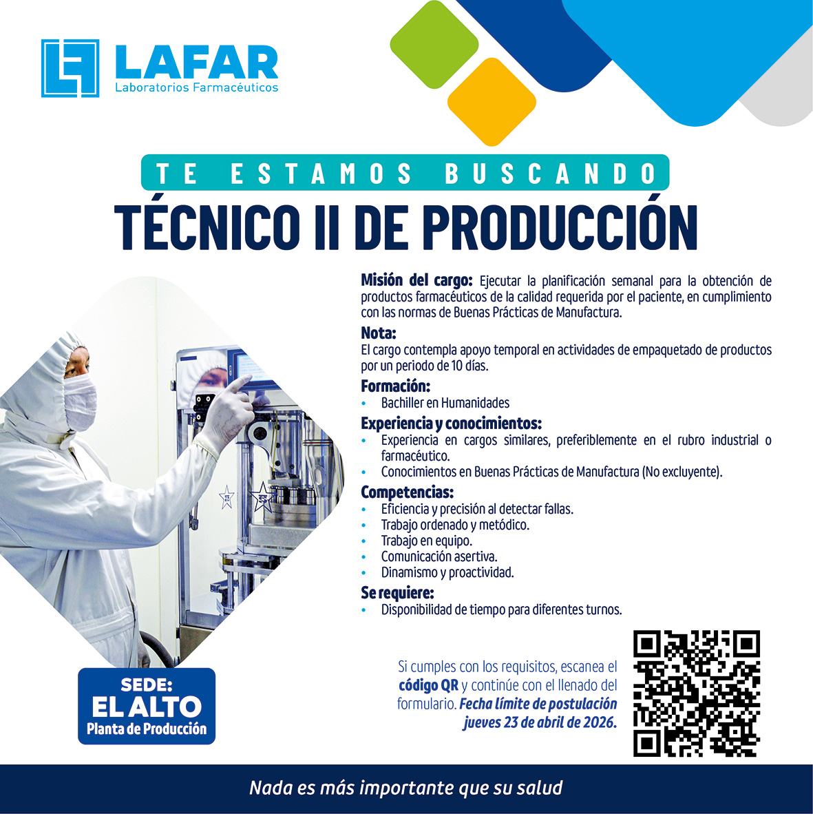 Misión del cargo: Ejecutar la planificación semanal para la obtención de productos farmacéuticos de la calidad requerida por el paciente, en cumplimiento con las normas de Buenas Prácticas de Manufactura.