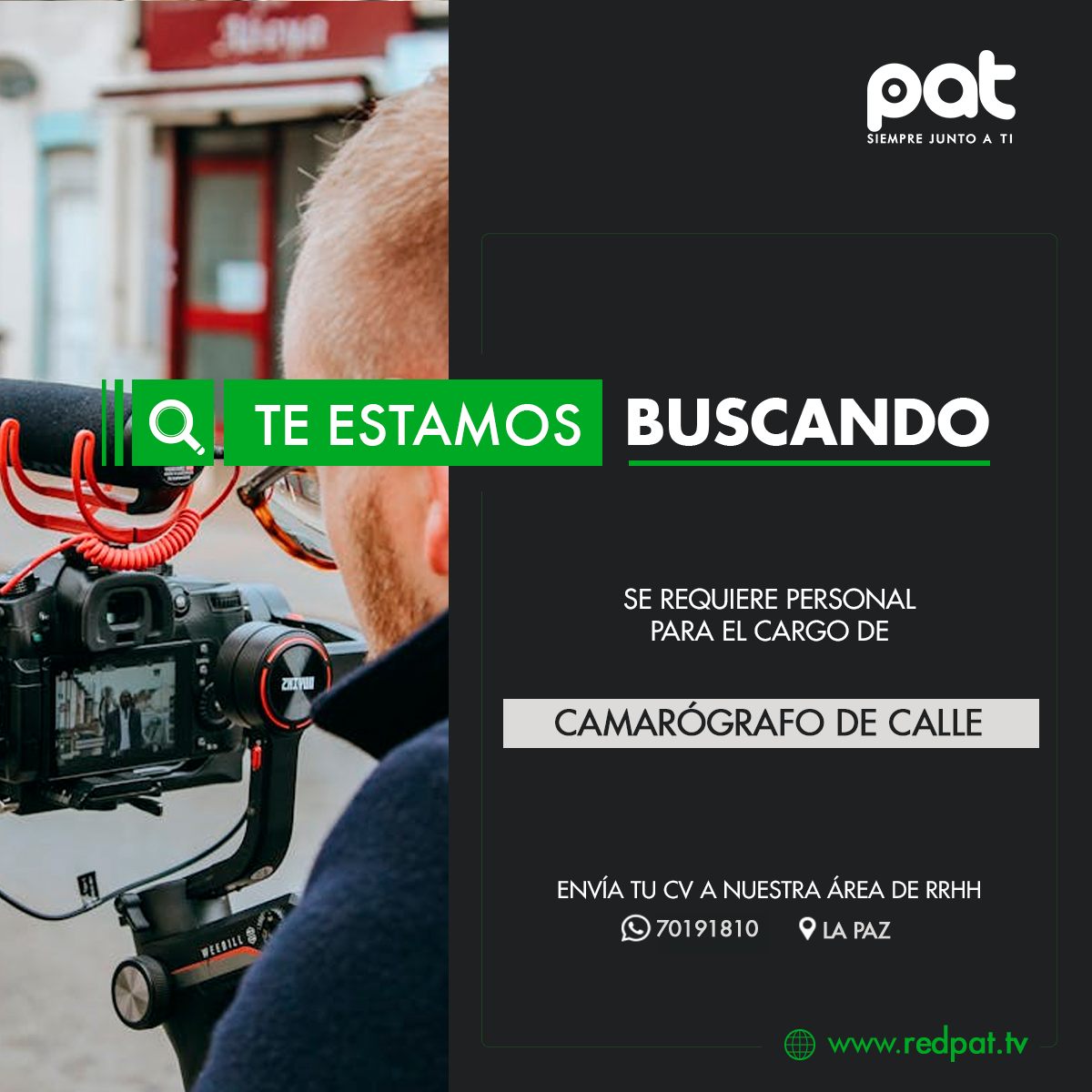 Descripción del empleo Red PAT busca incorporar personal para las áreas de:- Camarógrafo de calle Las personas interesadas pueden comunicarse al 70191810 Fuente https://www.facebook.com/photo?fbid=1333018065523953&set=pcb.1333018342190592