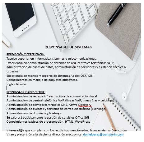 Interesad@s que cumplan con los requisitos mencionados, favor enviar su Curriculum Vitae y pretensión a la siguiente dirección electrónica: danielperez@transturin.com