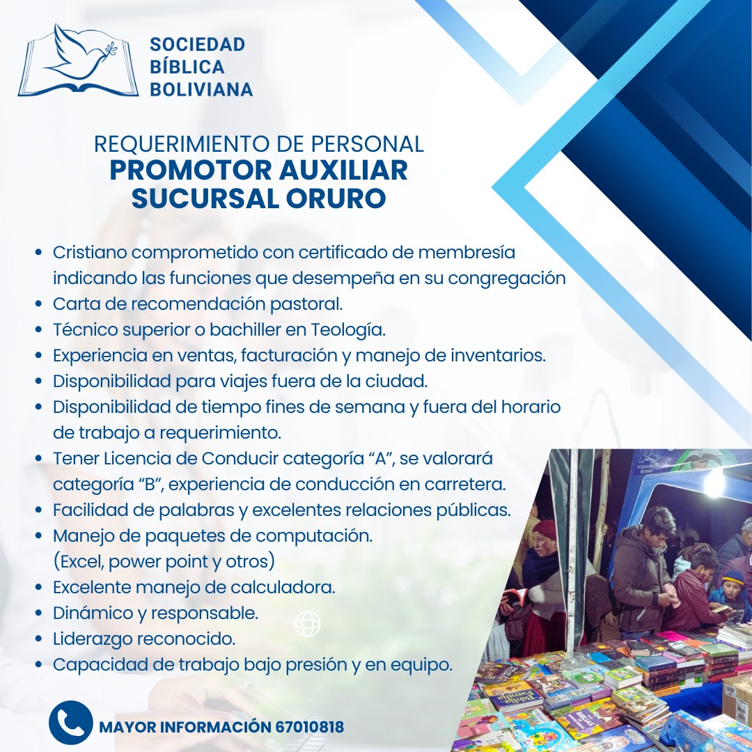 La Sociedad Bíblica Boliviana busca un Promotor Auxiliar con base en Oruro.