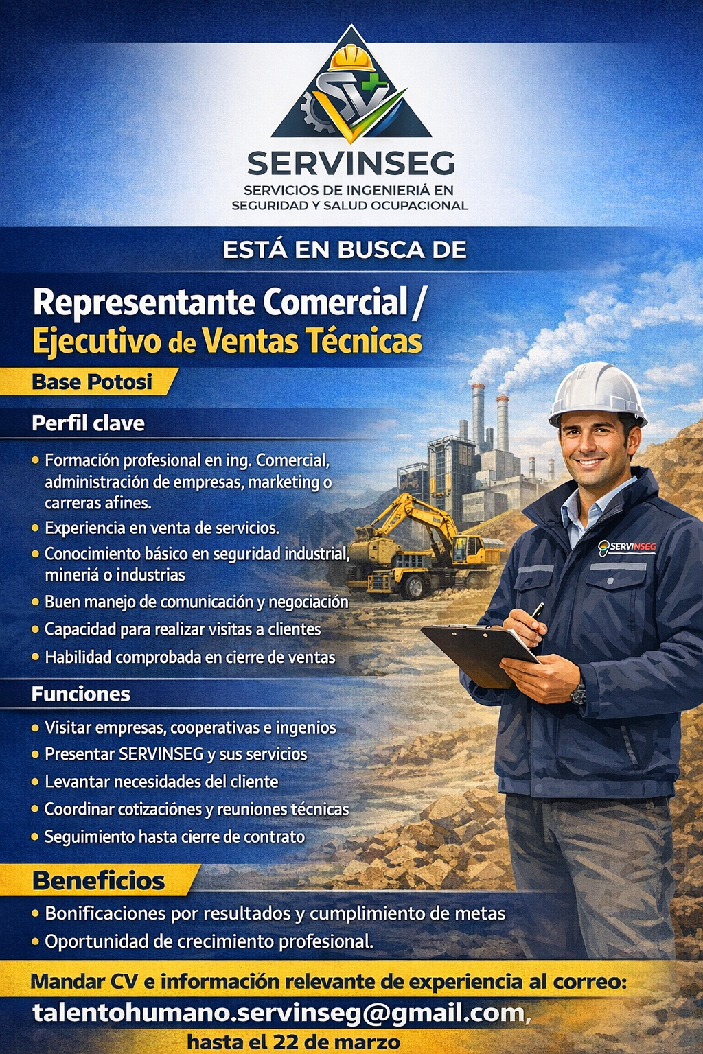 Profesional responsable de la promoción, comercialización y posicionamiento de los servicios de ingeniería en seguridad y salud ocupacional de SERVINSEG. Su función principal es identificar oportunidades de negocio en empresas, cooperativas e industrias, comprender las necesidades técnicas de los clientes y ofrecer soluciones adecuadas que generen valor y cumplimiento normativo.