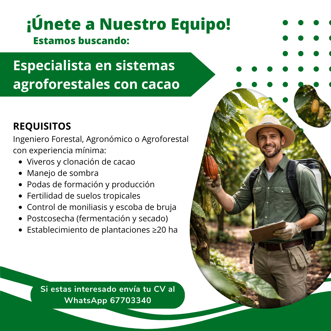 Buscamos un profesional que domine el campo, que conozca el cacao en cada etapa y que quiera liderar un proyecto de gran escala.Si sabes producir calidad, queremos hablar contigo.
