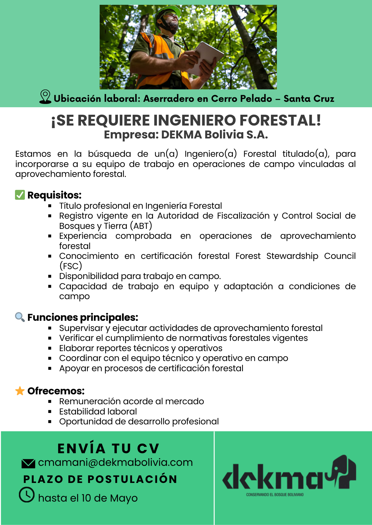 Estamos en la búsqueda de un(a) Ingeniero(a) Forestal titulado(a), para incorporarse a su equipo de trabajo en operaciones de campo vinculadas al aprovechamiento forestal.