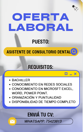 - Disponibilidad de jornada completa de 08:30 a 12:30 y 15:00 a 19:00 Enviar Curriculum Vitae al WhatsApp: 75423813