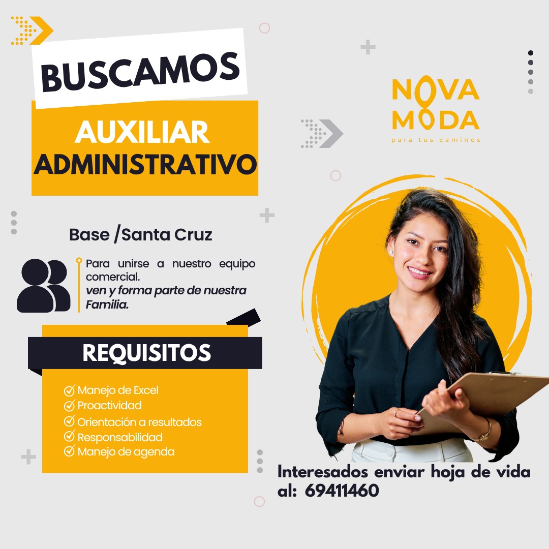 Nova Moda busca Auxiliar Administrativa en SANTA CRUZ para aplicar habilidades y conocimientos en un entorno dinámico, contribuyendo al éxito de la empresa y creciendo profesionalmente.