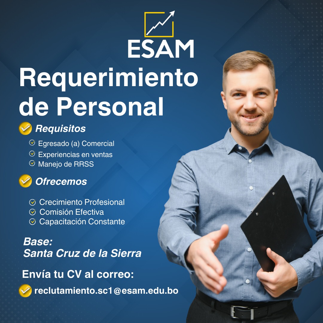 Envía tu Hoja de Vida (CV) actualizada con tus expectativas salariales al correo: reclutamiento.sc1@esam.edu.bo