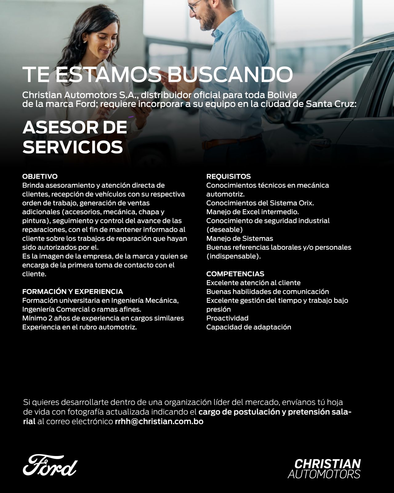 Descripción del empleo ¿Te apasiona la atención al cliente y el rubro automotriz?En Christian Automotors seguimos creciendo y queremos que formes parte de nuestro equipo en Santa Cruz. Fuente https://www.linkedin.com/posts/christian-automotors_fordbolivia-christianautomo…