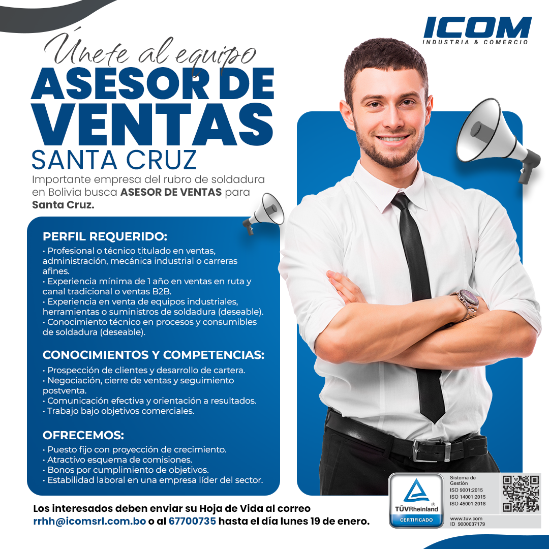 Los interesados deben enviar su Hoja de Vida al correo rrhh@icomsrl.com.bo o al 67700735 hasta el lunes 19 de enero.