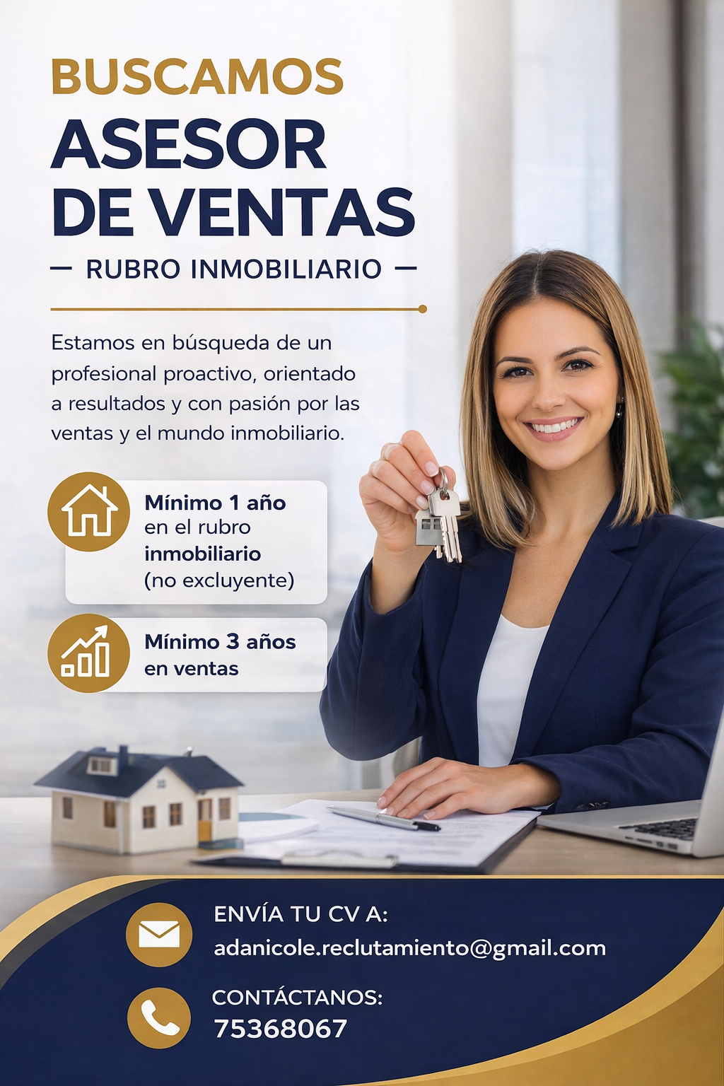 Nos encontramos en la búsqueda de un Asesor(a) Inmobiliario(a) orientado(a) a resultados, con alto enfoque comercial y habilidades de negociación, responsable de gestionar y concretar operaciones de venta de bienes inmuebles, brindando una experiencia de atención personalizada y de calidad al cliente.