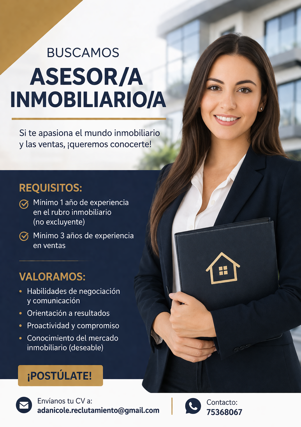 - Experiencia mínima de 1 año en el rubro inmobiliario (deseable, no excluyente).