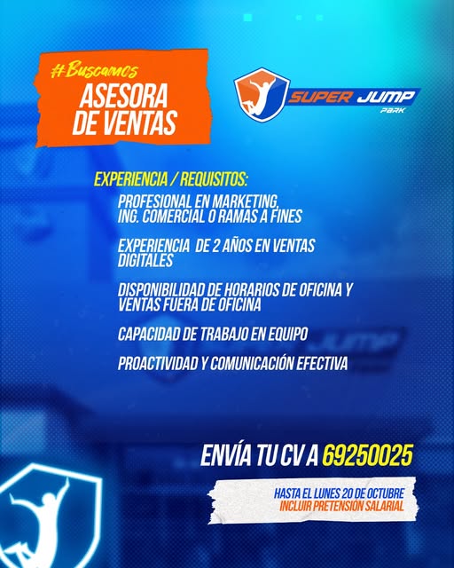 Descripción del empleo Si te apasionan las ventas y querés formar parte de un equipo que no para de crecer, este es tu lugar Sumate a la familia Super Jump Park. Postulate ahora. Fuente https://www.facebook.com/photo/?fbid=1231770695643062&set=a.606847191468752