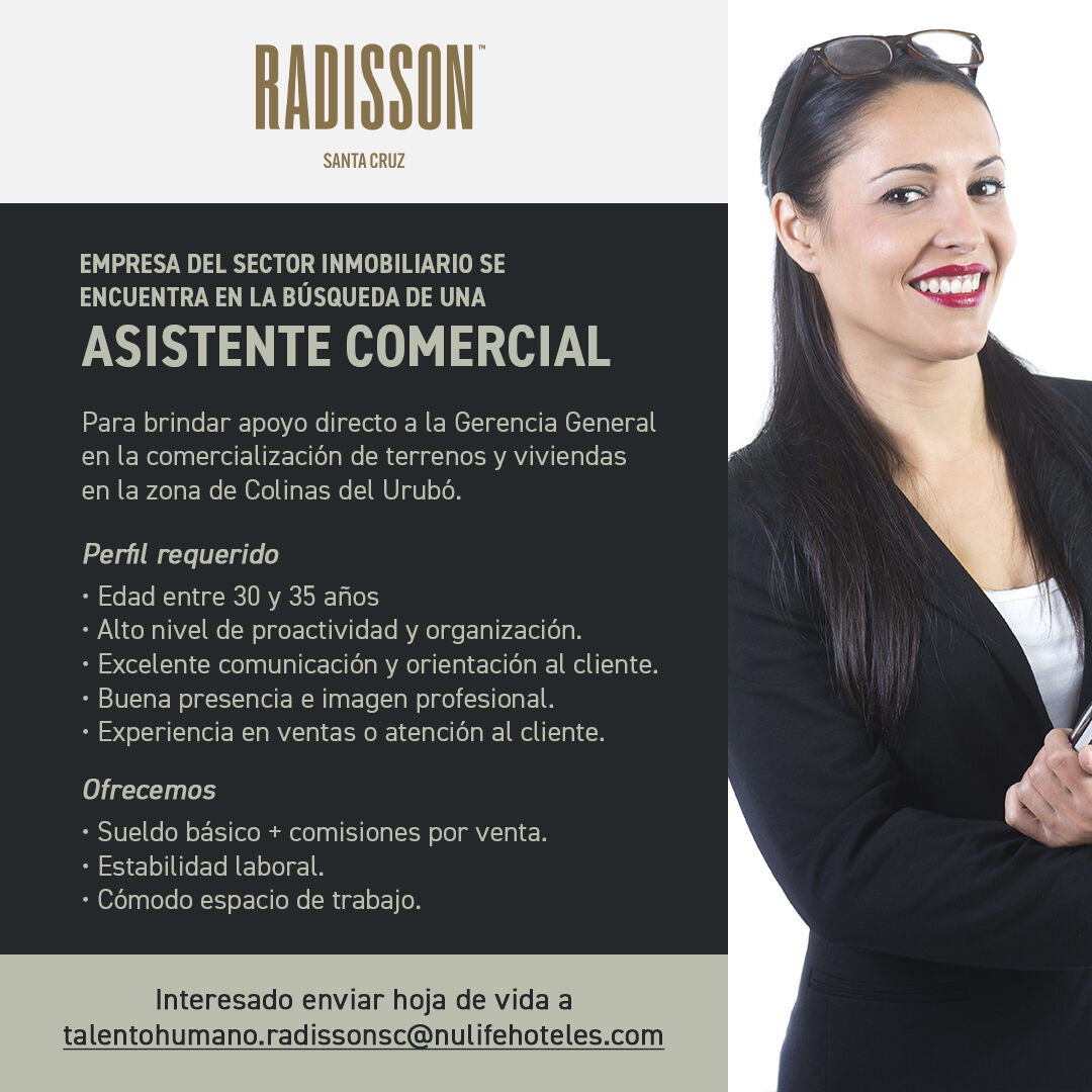Empresa del sector inmobiliario se encuentra en la búsqueda de una Asistente de Ventas para brindar apoyo directo a la Gerencia General en la comercialización de terrenos y viviendas en la zona de Colinas del Urubó.