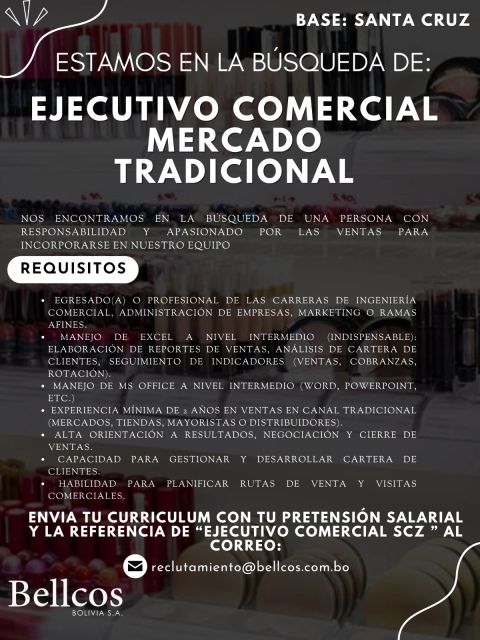 ENVIA TU CURRICULUM CON TU PRETENSIÓN SALARIAL Y LA REFERENCIA DE "EJECUTIVO COMERCIAL SCZ" AL