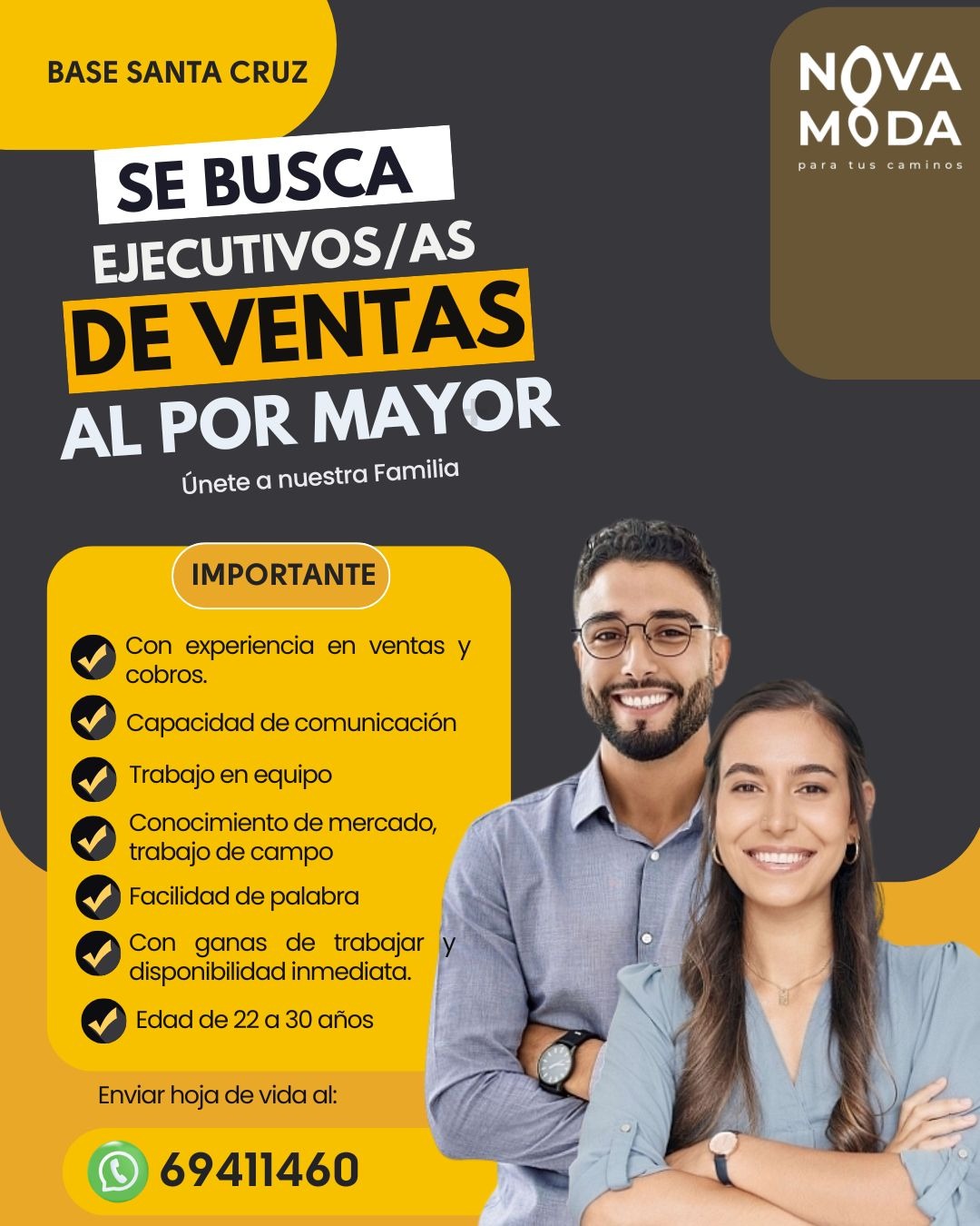 En NOVAMODA, una empresa líder en la importación y comercialización de zapatos brasileños, buscamos incorporar a un/a Ejecutivo/a de Ventas para nuestra sede en Santa Cruz . Si eres una persona dinámica entre 22 a 30 años a tiempo completo, con habilidades para la persuasión, proactiva, orientada a resultados y tienes la capacidad de establecer relaciones efectivas, ¡te estamos buscando!