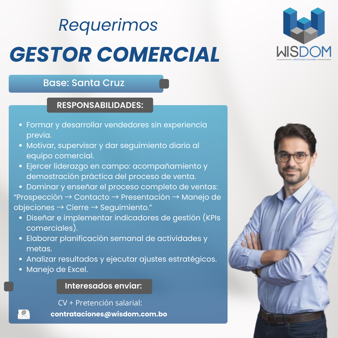 En WISDOM buscamos un Encargado/Gestor Comercial con perfil operativo y táctico, orientado al trabajo en campo. No buscamos solo un administrador de oficina, sino un líder que salga al mercado, acompañe al equipo y demuestre en la práctica cómo se generan y cierran ventas.