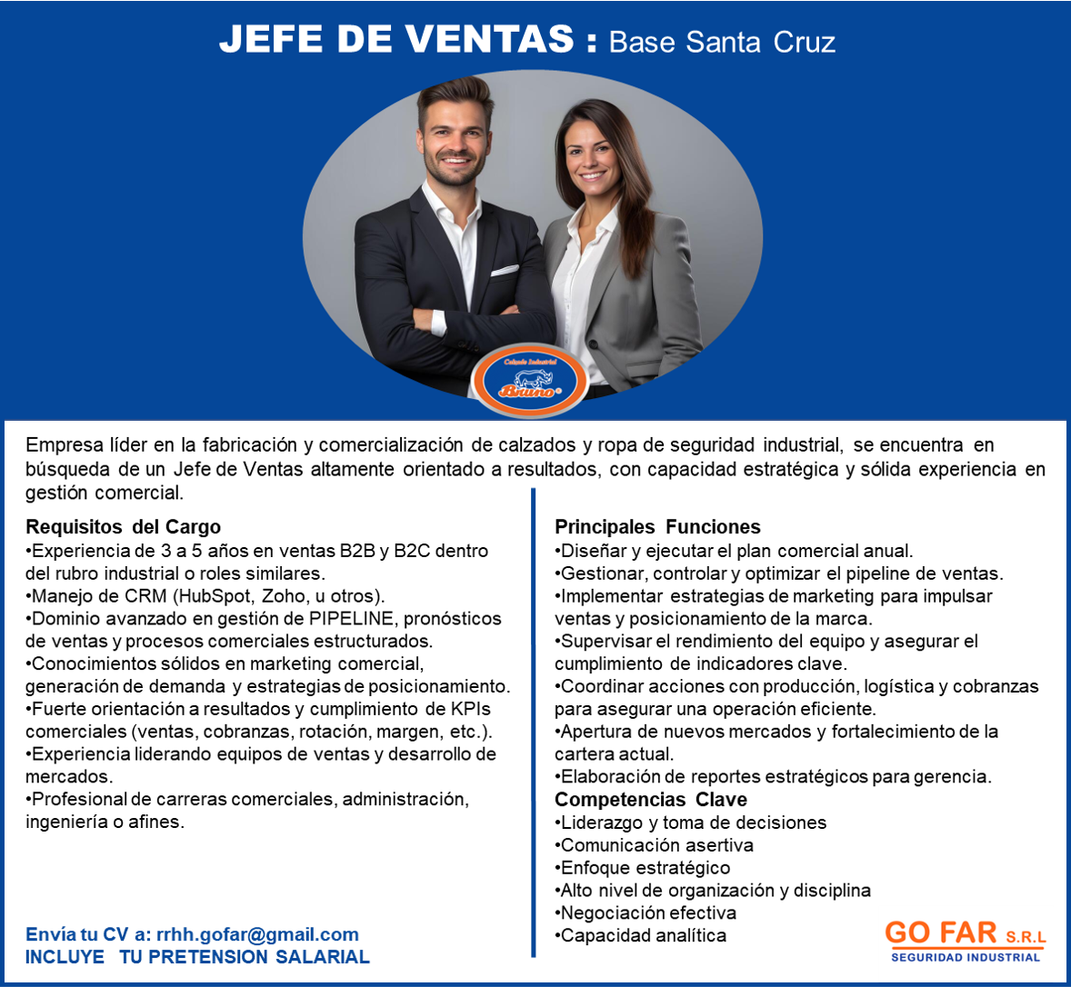 Empresa líder en la fabricación y comercialización de calzados y ropa de seguridad industrial, se encuentra en búsqueda de un Jefe de Ventas altamente orientado a resultados, con capacidad estratégica y sólida experiencia en gestión comercial.