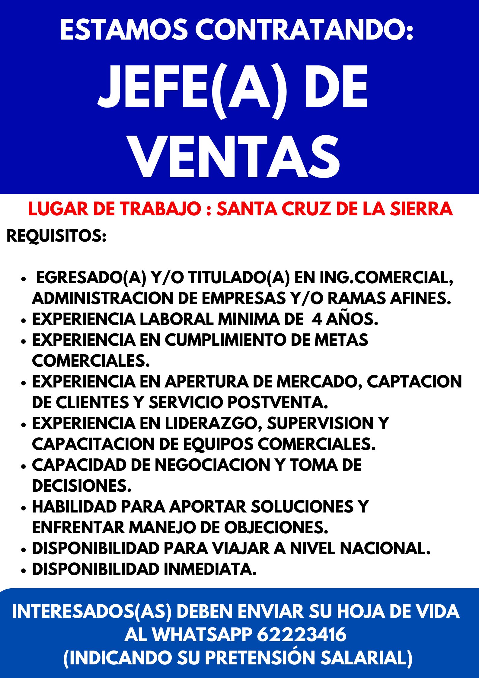 Interesados(as) deben enviar su hoja de vida al WhatsApp 62223416 (Indicando su pretensión salarial)