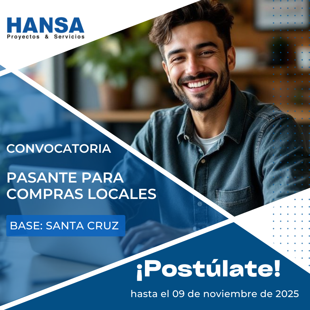 La División Proyectos & Servicios de HANSA LTDA. busca incorporar un Pasante para Compras Locales, con sede en la ciudad de Santa Cruz