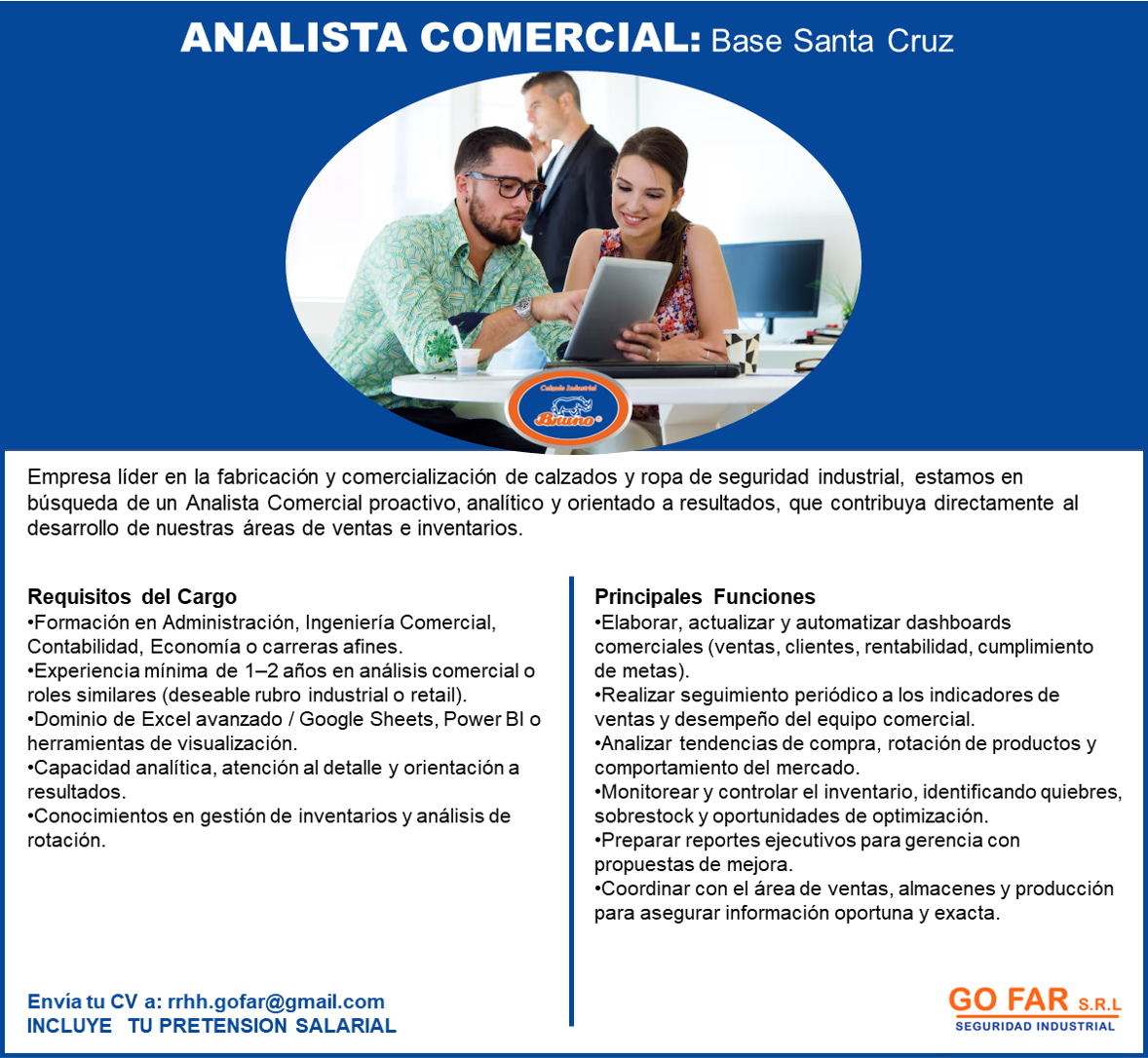 Empresa líder en la fabricación y comercialización de calzados y ropa de seguridad industrial, estamos en búsqueda de un Analista Comercial proactivo, analítico y orientado a resultados, que contribuya directamente al desarrollo de nuestras áreas de ventas e inventarios.