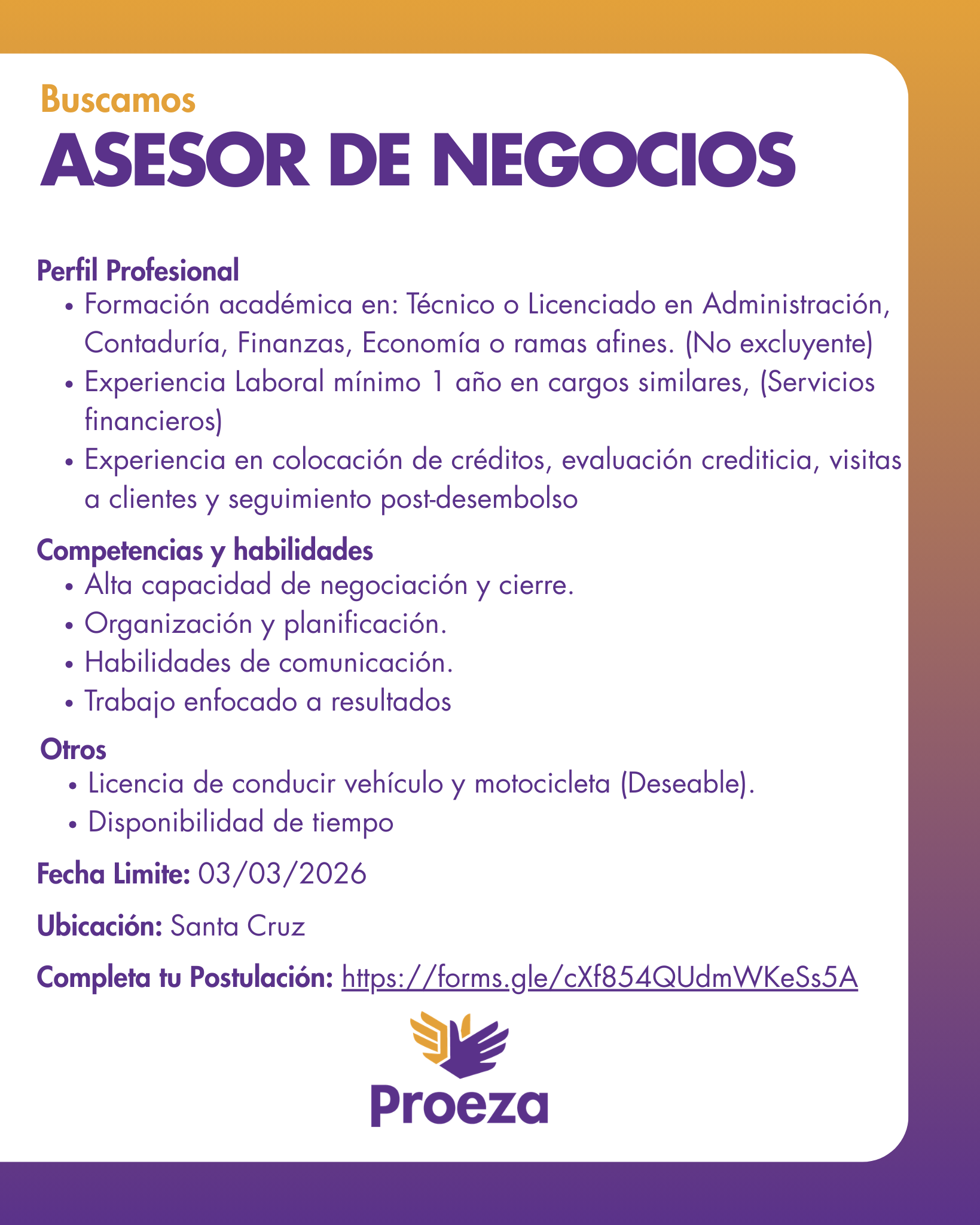 En Proeza buscamos incorporar a nuestro equipo un(a) Asesor(a) de Negocios para la ciudad de Santa Cruz.