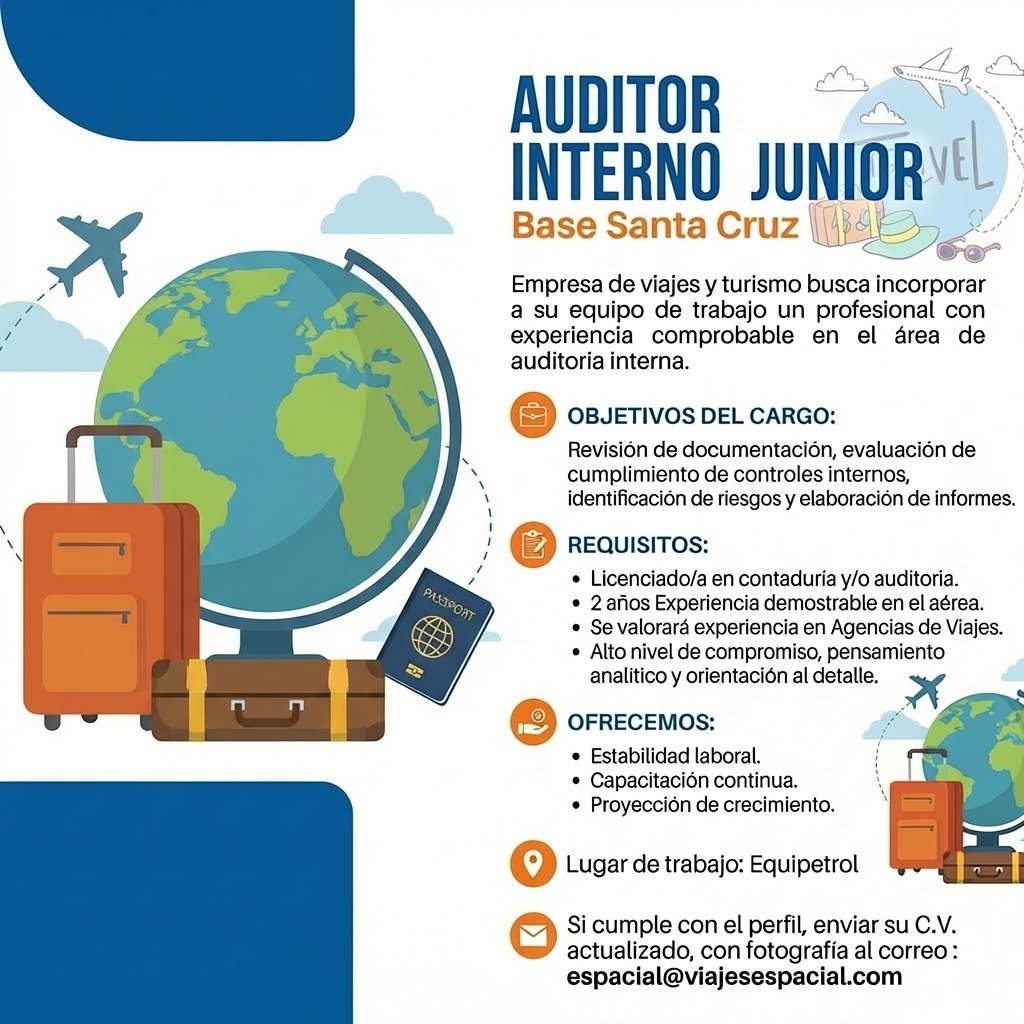 Empresa de viajes y turismo ✈️🚢 busca incorporar a su equipo de trabajo un profesional con experiencia comprobable en el área de auditoría interna.