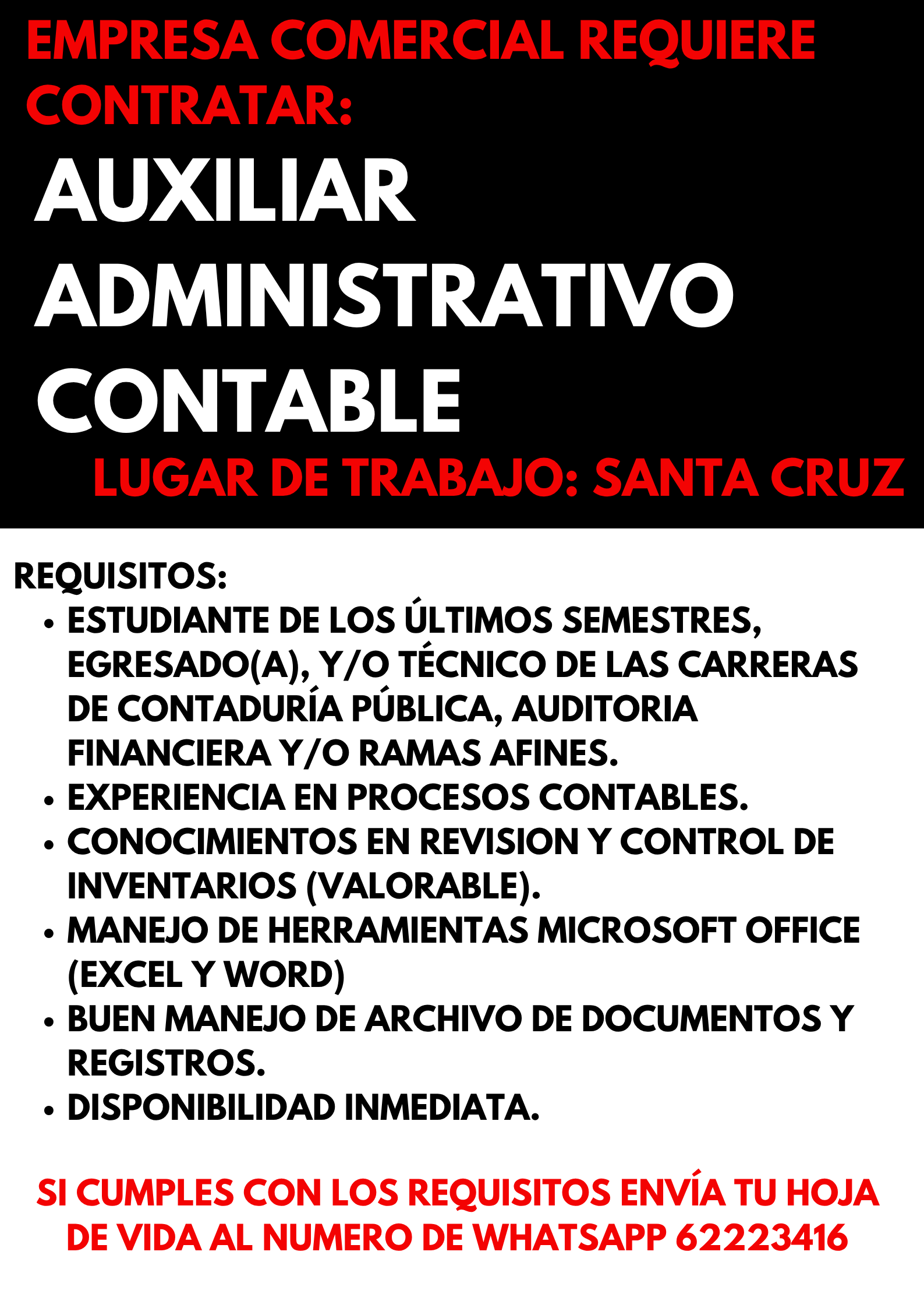 Si cumples con los requisitos envía tu hoja de vida Al numero de WhatsApp 62223416