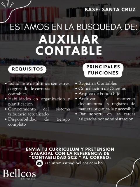 Descripción del empleo ENVIA TU CURRICULUM Y PRETENSION SALARIAL CON LA REFERENCIA DE "CONTABILIDAD SCZ" AL CORREO:reclutamiento@bellcos.com.bo Fuente https://www.linkedin.com/posts/buscamos-auxiliar-contable-para-la-ciudad-share-… Reportar este empleo