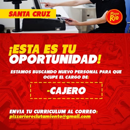 Descripción del empleo Pizza Río está buscando CAJEROS para nuestras sucursales en Santa Cruz. Enviá tu CV a: pizzarioreclutamiento@gmail.com Fuente https://www.facebook.com/photo/?fbid=787820964001338&set=a.160541840062590 Reportar este empleo