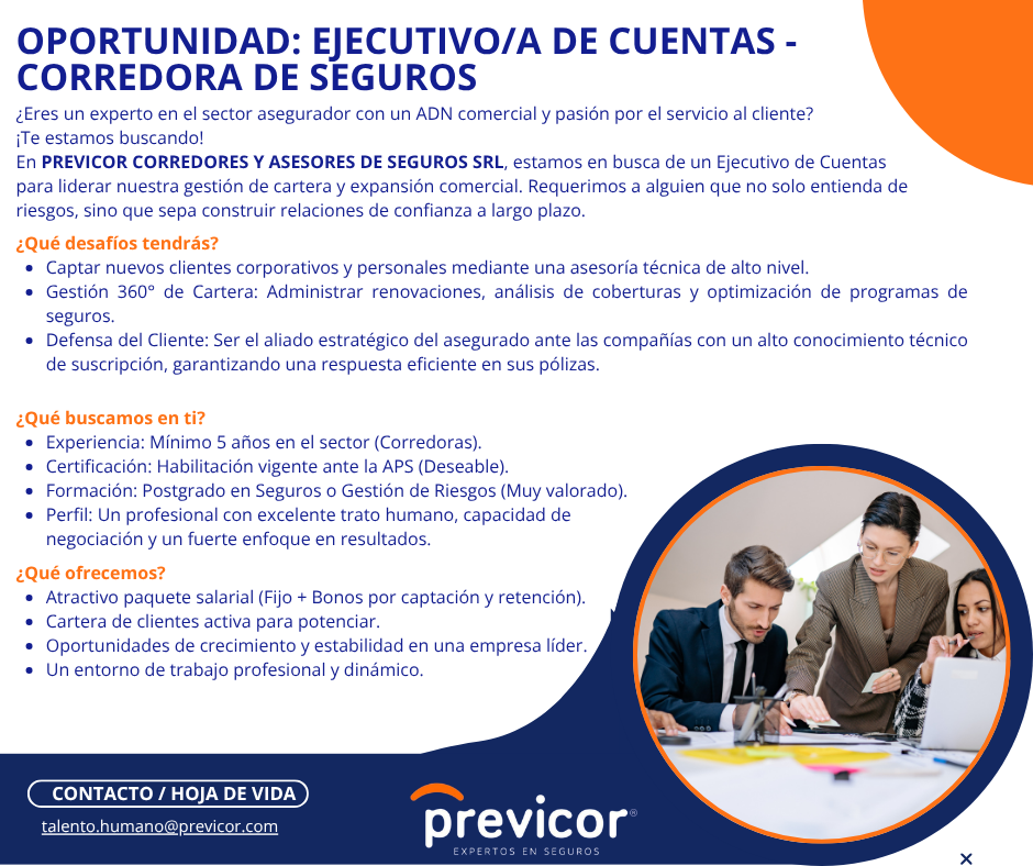 En PREVICOR CORREDORES Y ASESORES DE SEGUROS SRL, estamos en busca de un Ejecutivo de Cuentas para liderar nuestra gestión de cartera y expansión comercial. Requerimos a alguien que no solo entienda de riesgos, sino que sepa construir relaciones de confianza a largo plazo.