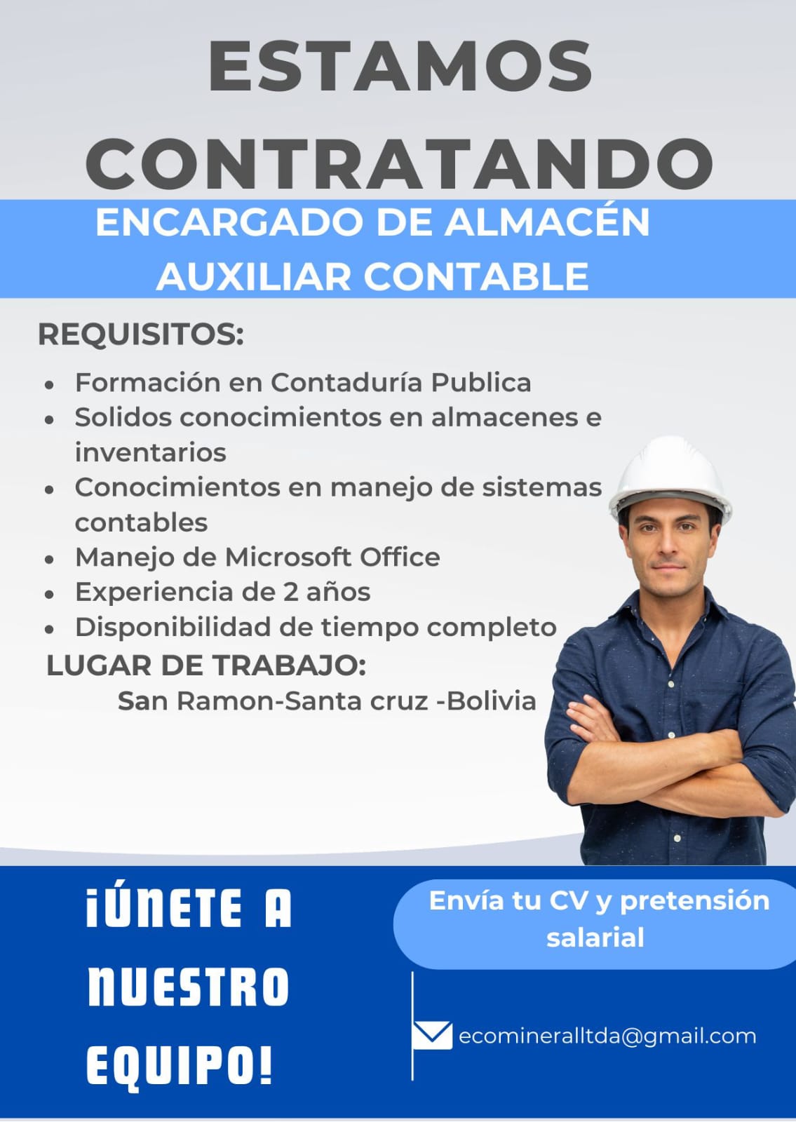 Envía tu hoja de vida y pretensión salarial al correo : ecomineralltda@gmail.com