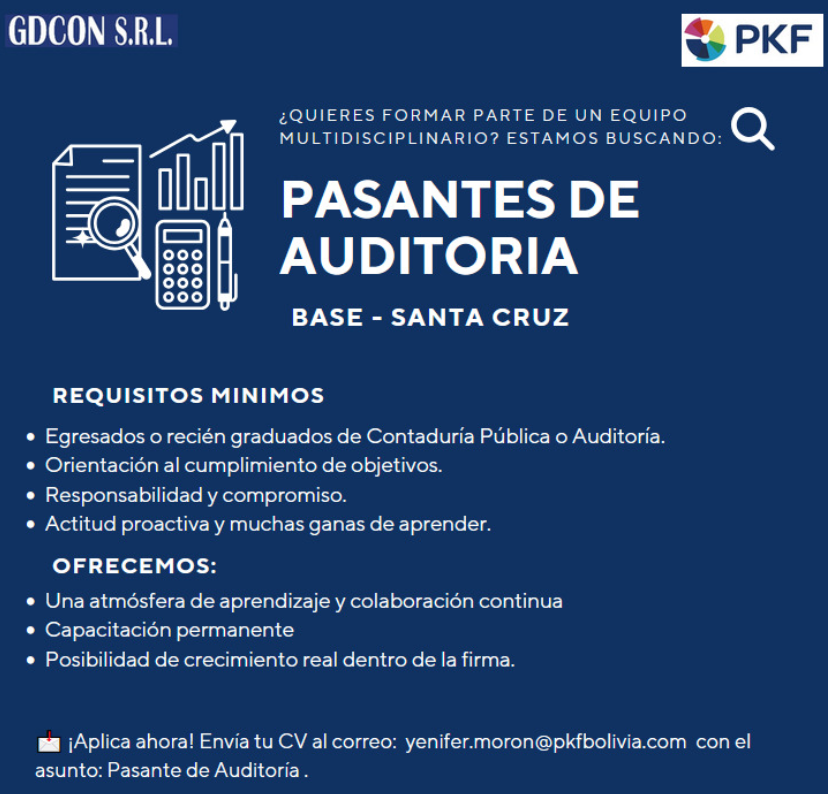 Envíanos tu hoja de vida a: yenifer.moron@pkfbolivia.com ó al WhatsApp 78032676