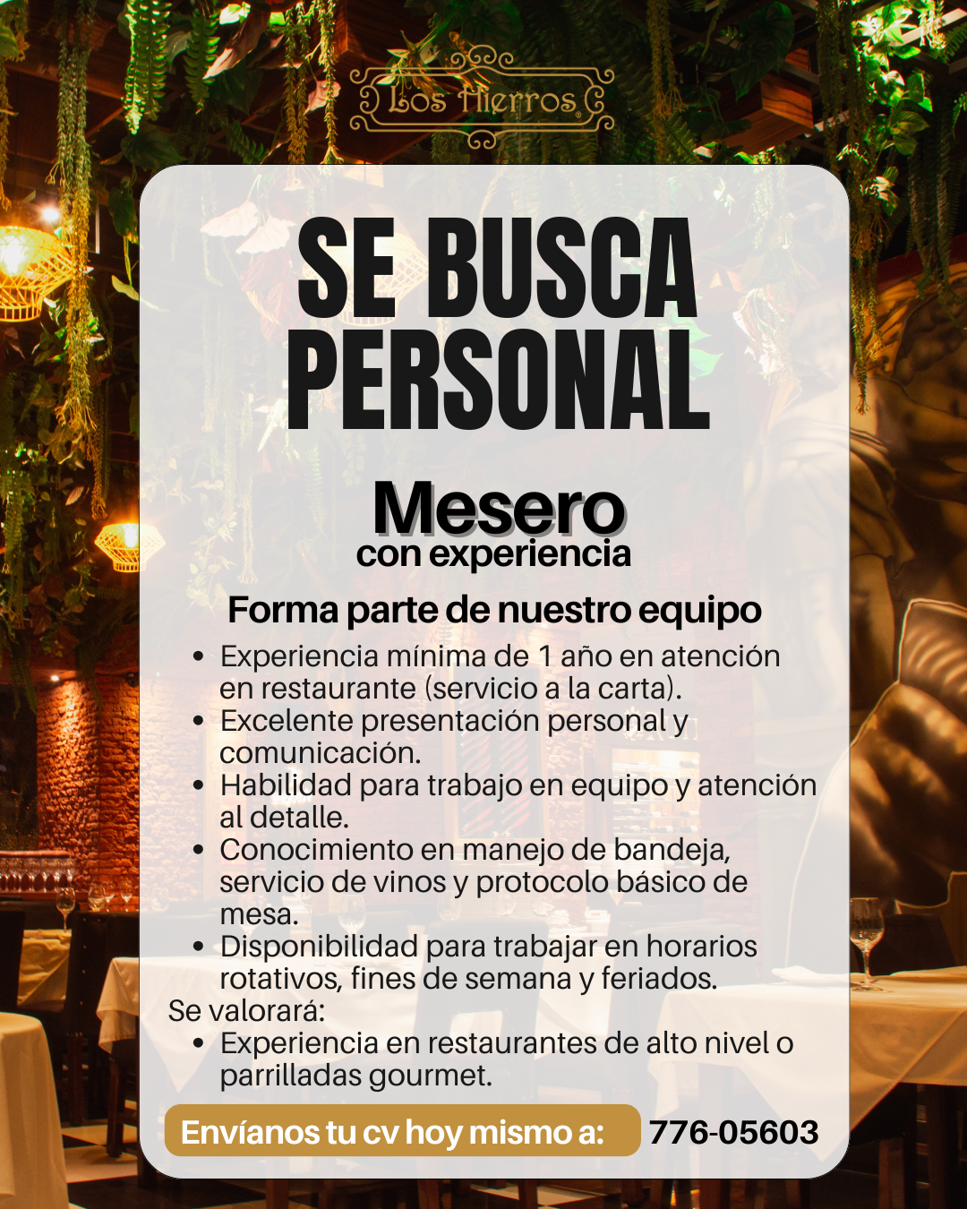 - Experiencia mínima de 1 año en atención en restaurante (servicio a la carta).