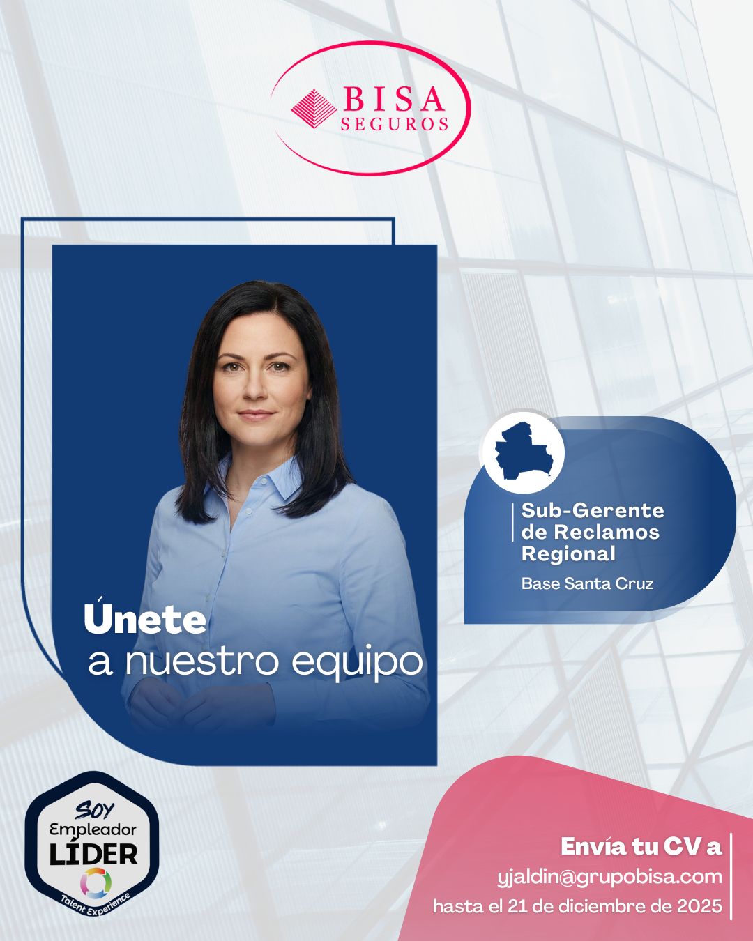 Envía tu Hoja de Vida al correo yjaldin@grupobisa.com con el asunto: “Subgerente de Reclamos Regional Santa Cruz”.