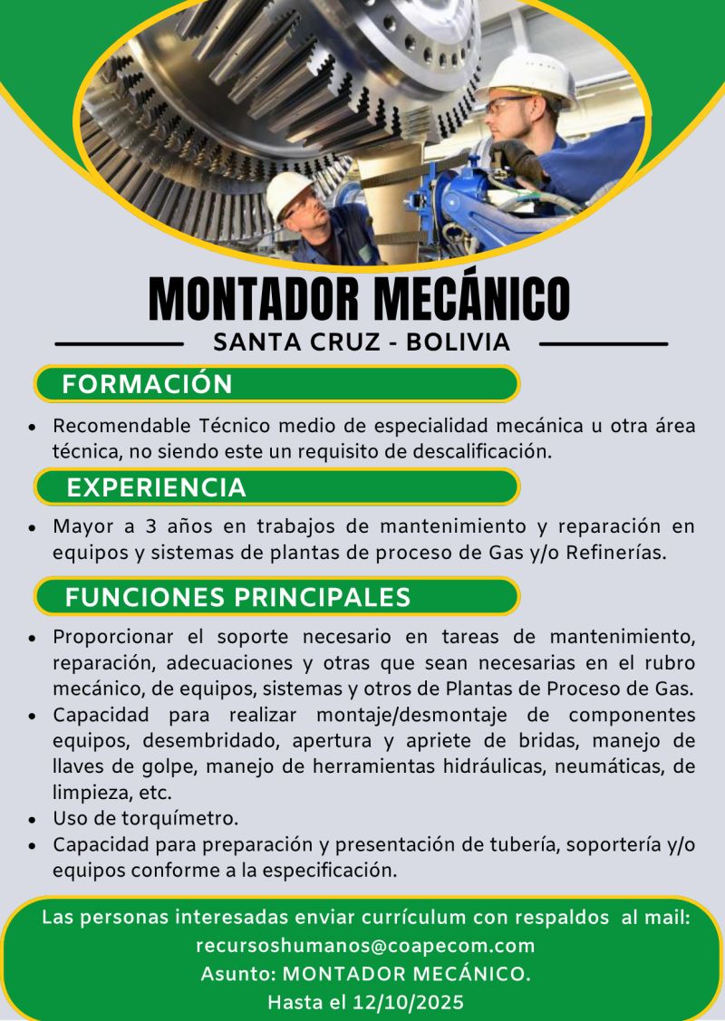 Estamos buscando un Montador Mecánico con experiencia sólida en mantenimiento y reparación de equipos, en plantas de gas o refinerías. Si te apasiona trabajar con precisión, manejar herramientas hidráulicas, neumáticas y torquímetros, ¡este es tu lugar!