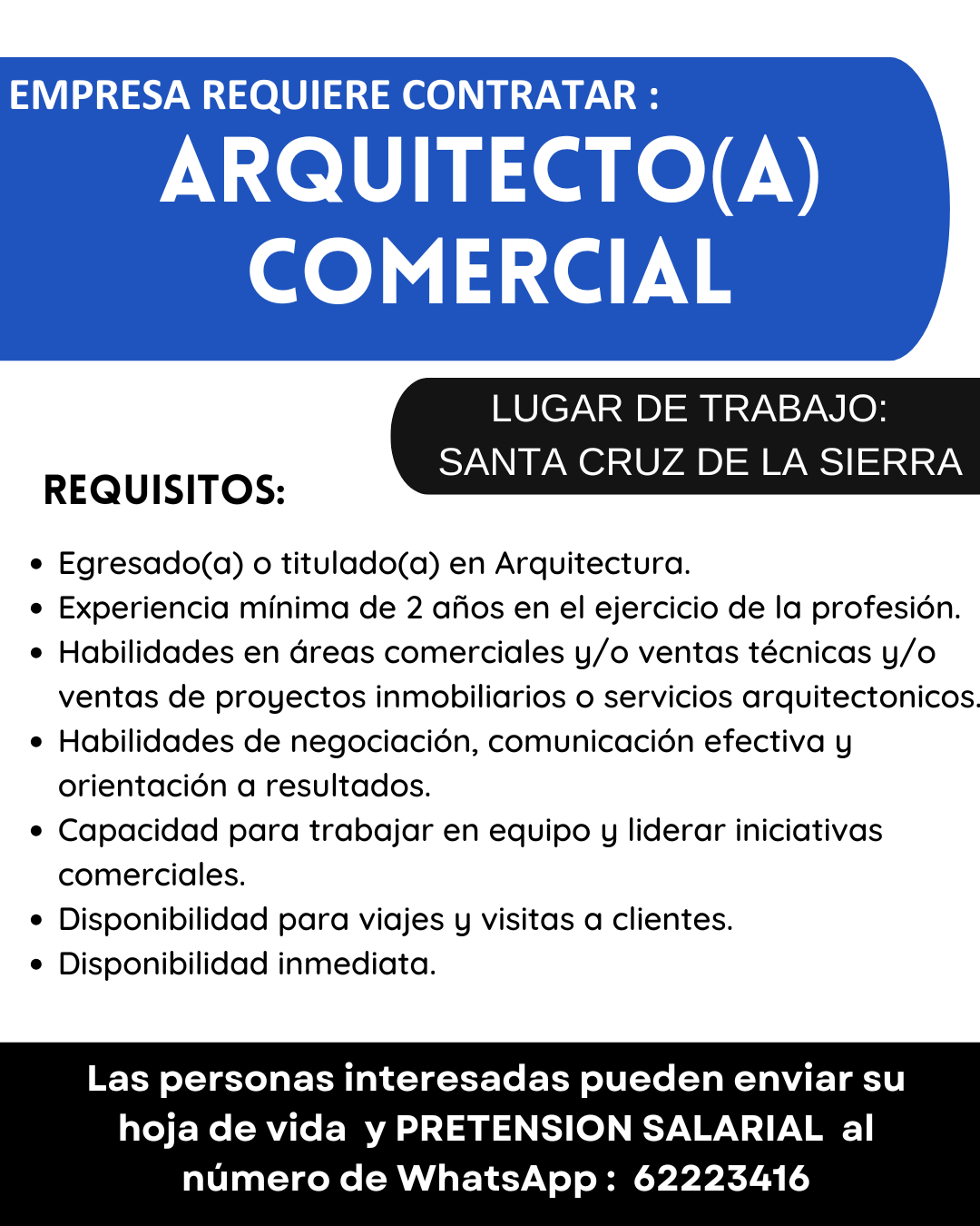 Las personas interesadas pueden enviar su hoja de vida y PRETENSION SALARIAL al número de WhatsApp : 62223416