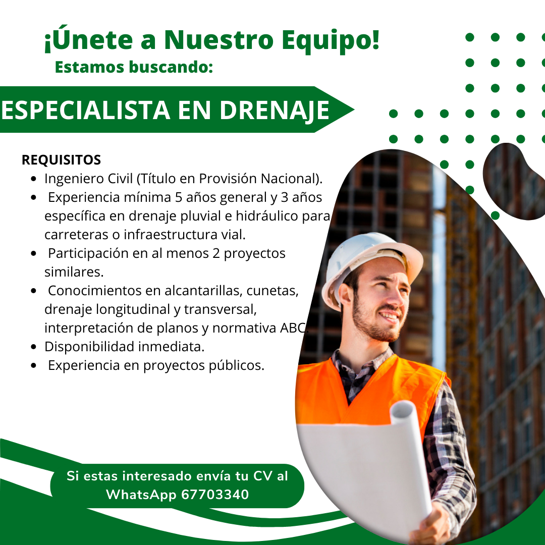 GENESIS LTDA., empresa constructora, se encuentra en la búsqueda de un/a Especialista en Drenaje, para incorporarse a proyectos viales.
