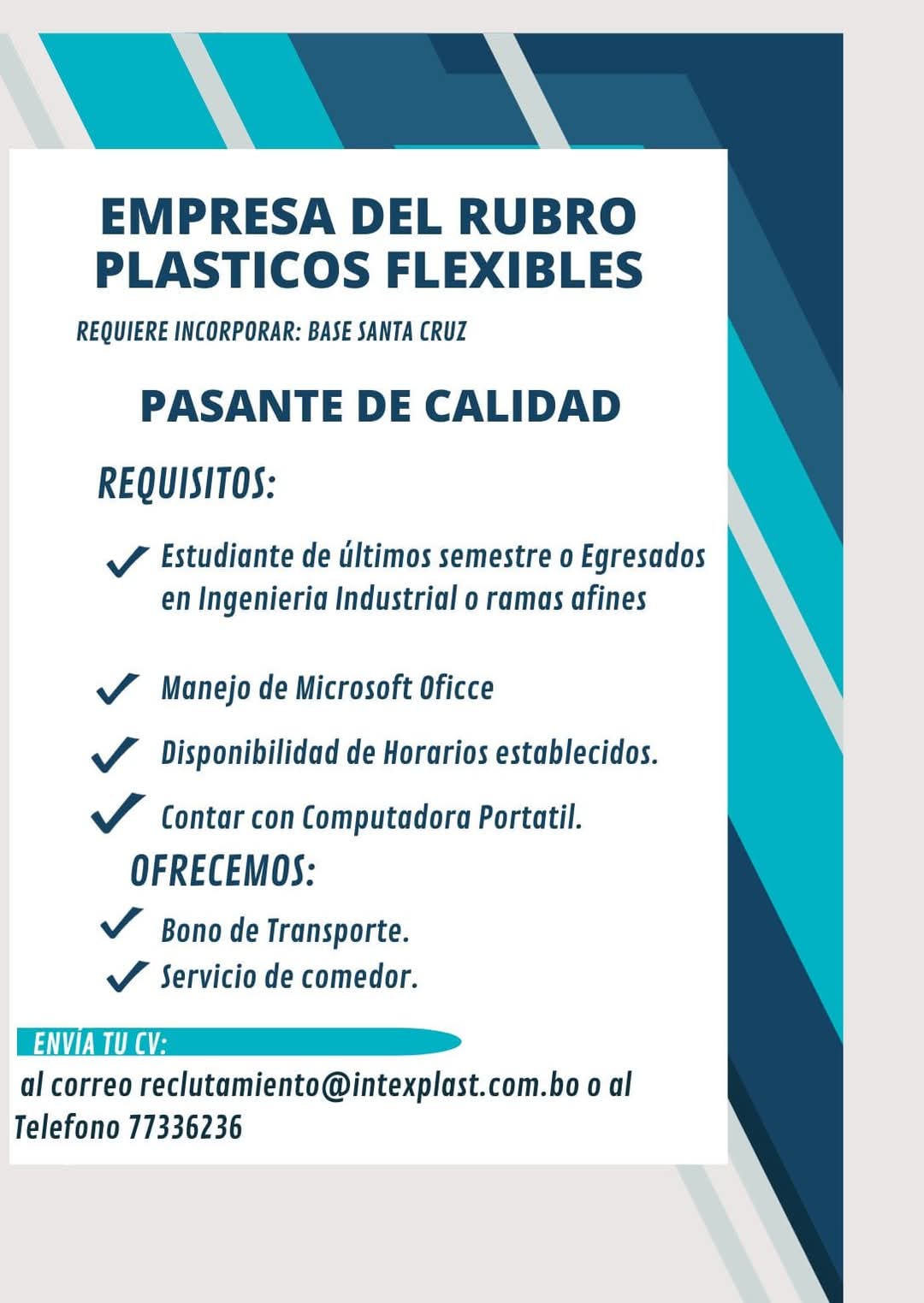 Si cumples con este perfil, postúlate enviando tu curriculum a reclutamiento@intexplast.com.bo o al 77336236 - 75094154 hasta el 15 de enero 2026.