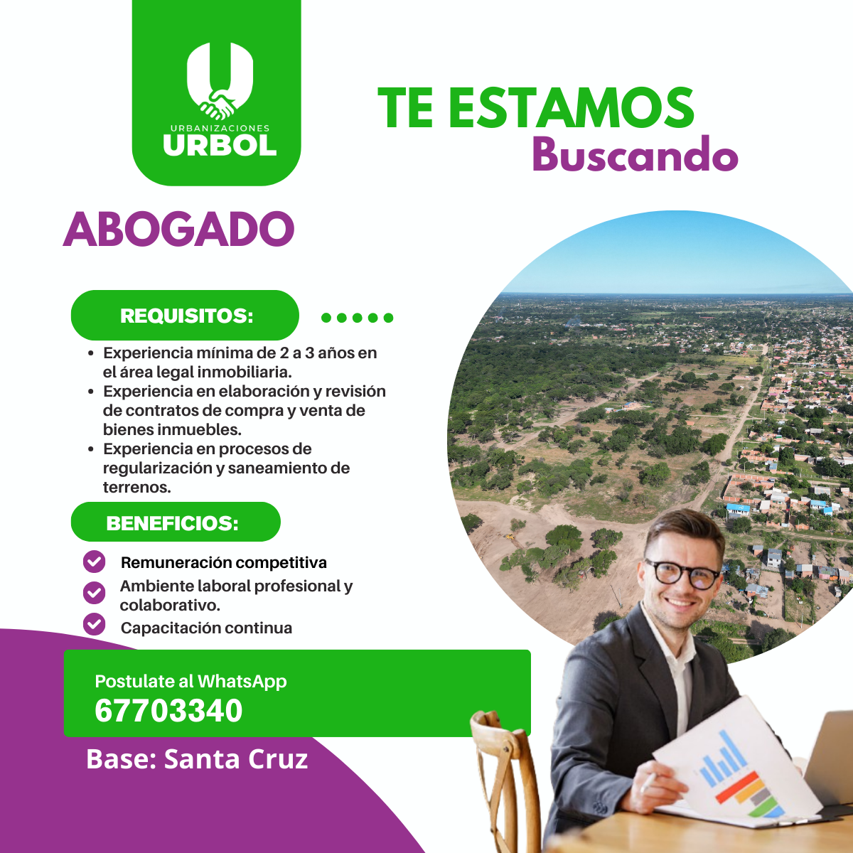 Empresa del rubro inmobiliario se encuentra en la búsqueda de un Abogado con experiencia en bienes inmuebles para formar parte de su equipo de trabajo. El profesional será responsable de brindar asesoramiento legal en operaciones de compra y venta de terrenos, elaboración y revisión de contratos, así como la gestión de trámites ante instituciones correspondientes. Buscamos una persona con criterio jurídico, capacidad de análisis y orientación a la seguridad legal de las operaciones inmobiliarias.