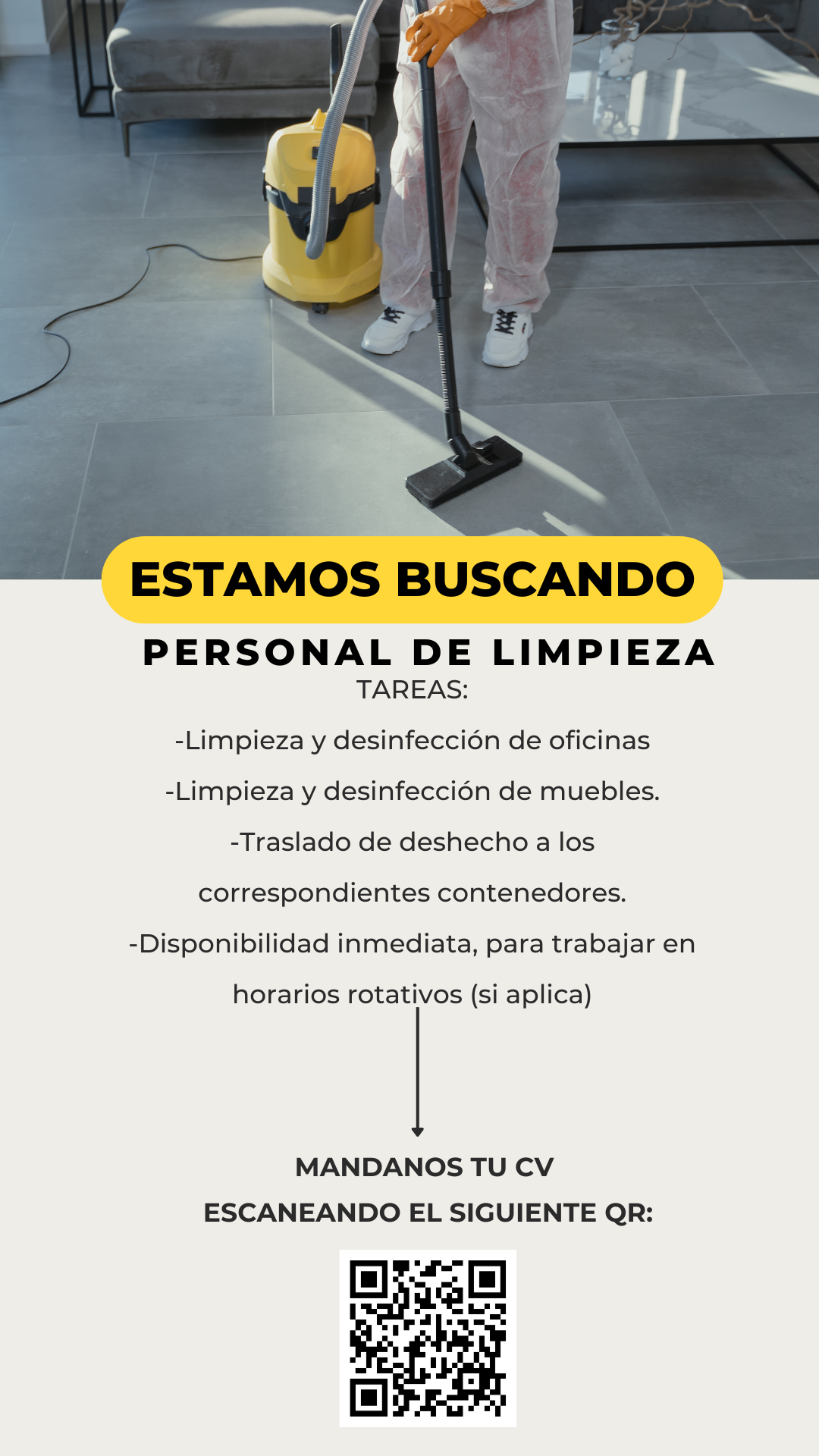 Buscamos personal de limpieza responsable y comprometido para mantener en óptimas condiciones las instalaciones de la empresa. Entre sus funciones principales están la limpieza de oficinas, áreas comunes y sanitarios, asegurando un ambiente ordenado, higiénico y agradable para todos.
