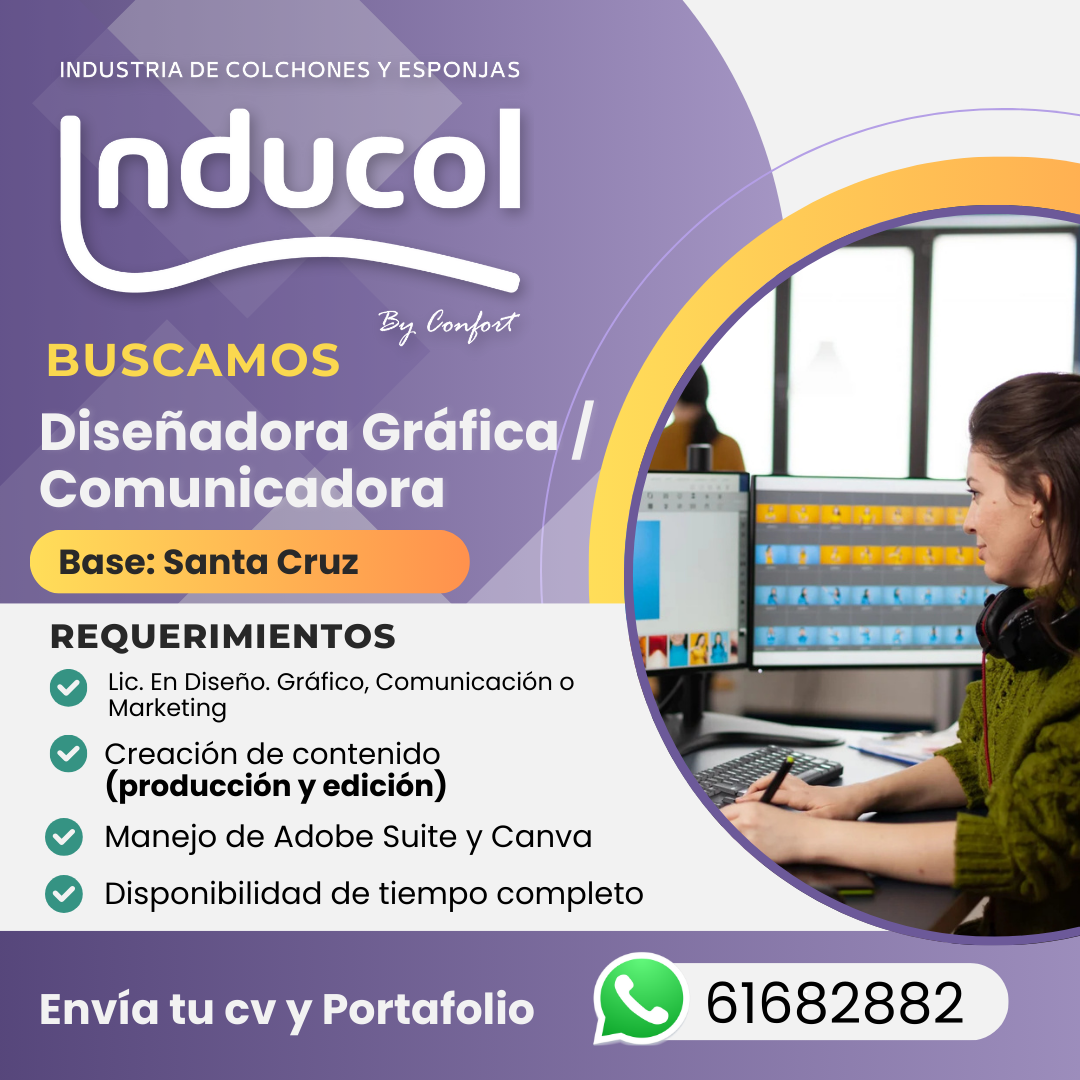 ¡Estamos contratando! 🚀En Inducol buscamos Diseñadora Gráfica / Comunicadora✔ Contenido y edición✔ Adobe Suite y Canva✔ Tiempo completo📍 Santa Cruz📲 Envía tu CV y portafolio al 61682882