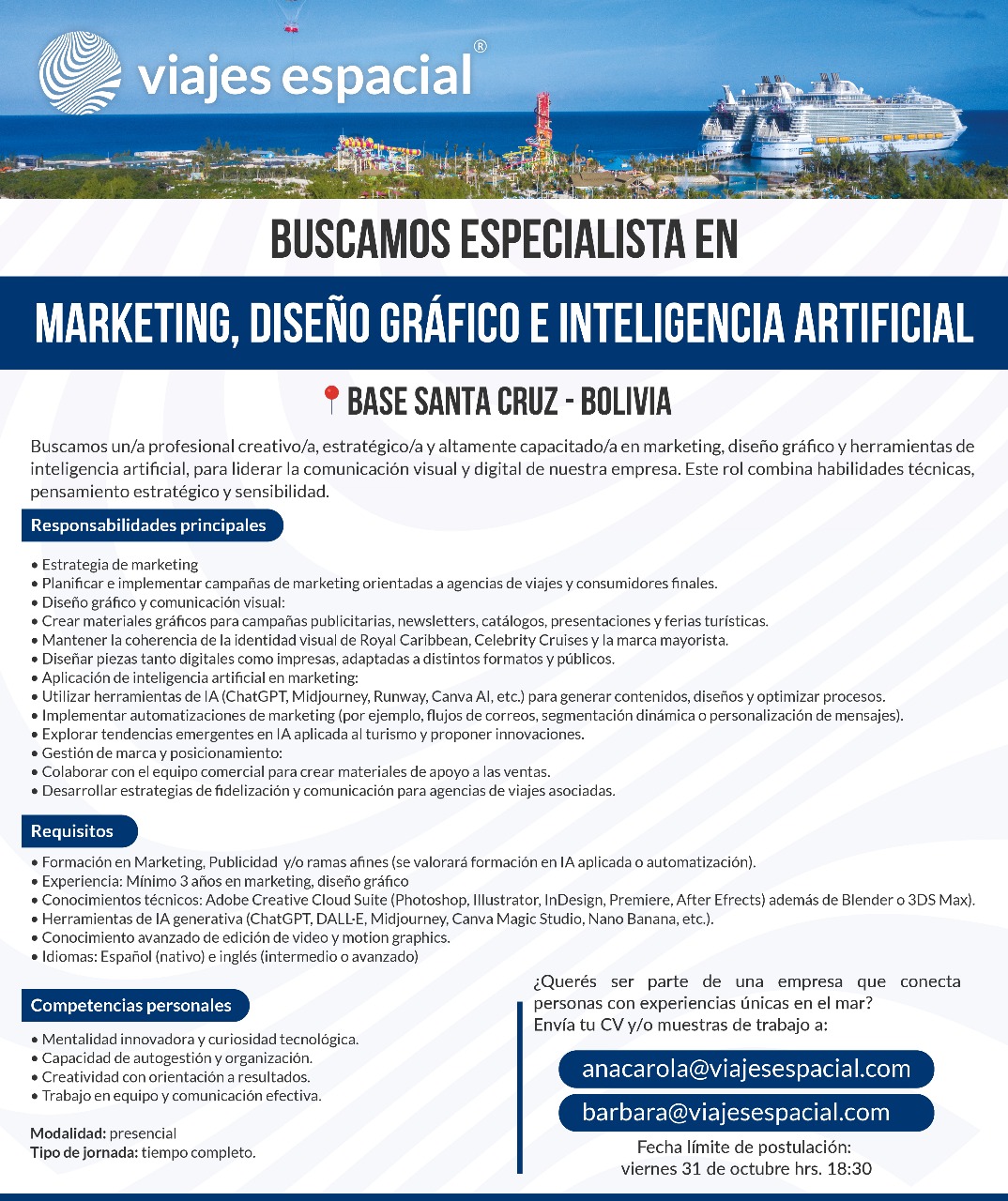 💌 Envía tu CV y portafolio a: anacarola@viajesespacial.com - barbara@viajesespacial.com 📅 Fecha límite: Viernes 31 de octubre, 18:30 hrs.
