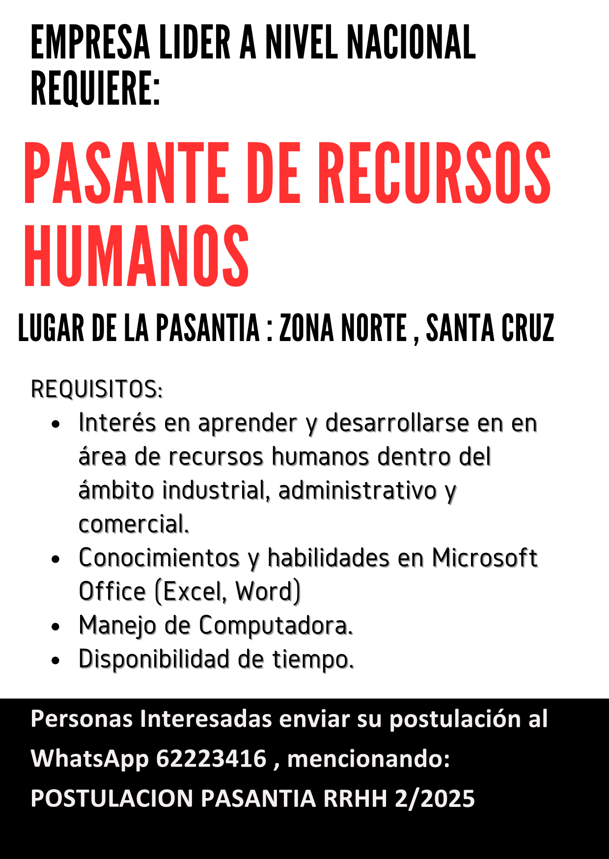 Personas Interesadas enviar su postulación al WhatsApp 62223416 , mencionando: POSTULACION PASANTIA RRHH 2025
