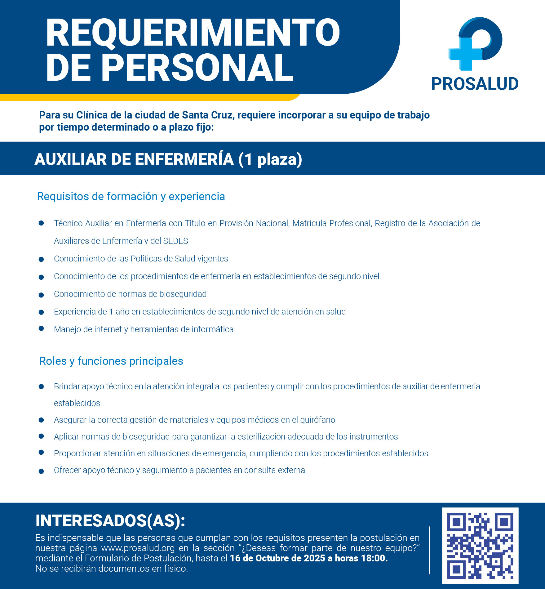 Requerimiento de Personal PROSALUD para la ciudad de Santa Cruz